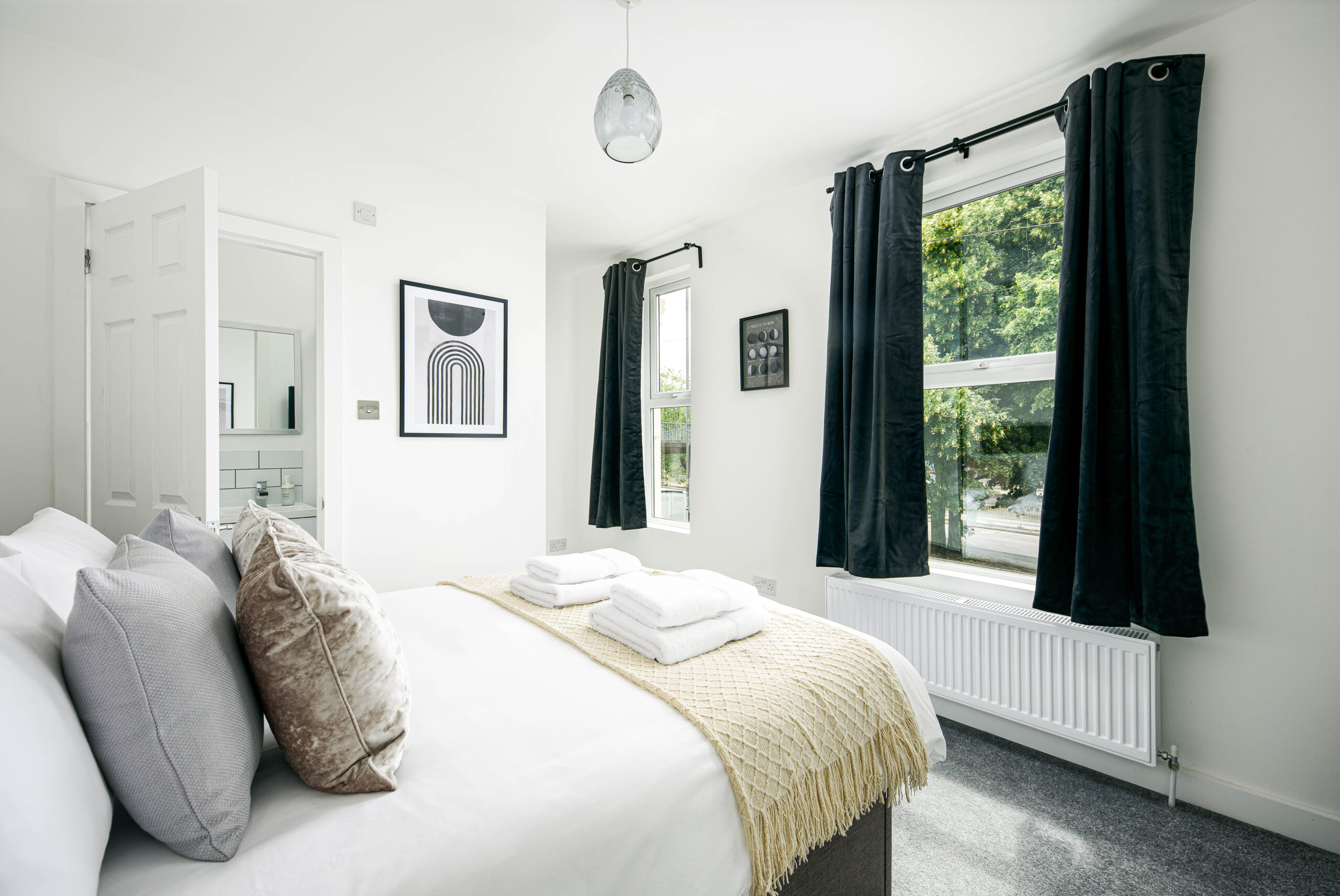 This home hosts three generous sized bedrooms. Two upstairs, both with en suite bathrooms with the additional one downstairs sleeping up to 6 guests comfortably.